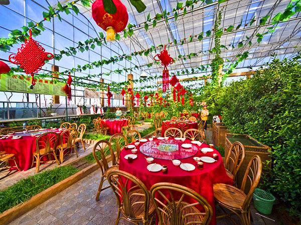 生態餐廳又稱"陽光餐廳",是現代都市倡導的是一種新的休閑理念,是近年來人們對健康飲食的追求和對田園風光的向往而興起的一種新型餐飲形式,是綜合運用建筑學、園林學、設施園藝學、生態學等相關學科知識進行規劃、設計和建設,以設施調控技術、農藝栽培及管理技術來維護餐廳的優美環境,形成以綠色景觀植物為主,蔬、果、花、草為輔的植物配置格局,結合假山、瀑布、小橋流水、竹木亭閣等園林景觀,全方位立體展現綠色、優美、宜人、健康的就餐環境。并通過溫度、濕度的控制,達到室內四季如春。我公司承建的生態餐廳,克服了種植溫室易結露,以"大空間、舒適、環保"為概念,設計開發了高屋脊、大跨度、大開間的專用類型。外觀造型美觀,恢宏大氣,內部視野開闊,寬敞明亮。置身于其中,既能感受田園的韻味,又享受美味佳肴。