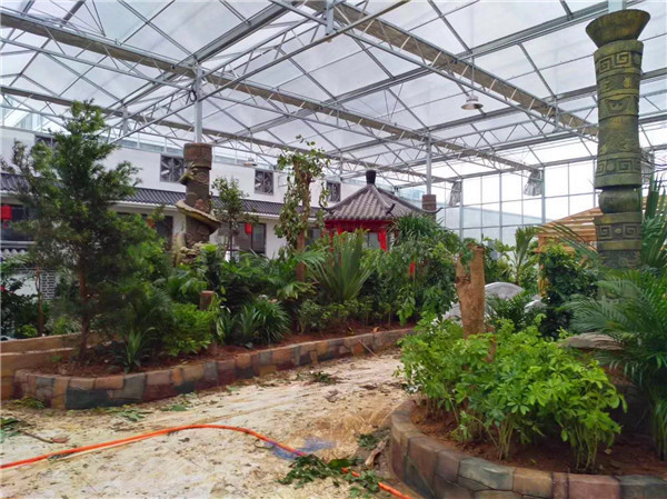 生態餐廳又稱"陽光餐廳",是現代都市倡導的是一種新的休閑理念,是近年來人們對健康飲食的追求和對田園風光的向往而興起的一種新型餐飲形式,是綜合運用建筑學、園林學、設施園藝學、生態學等相關學科知識進行規劃、設計和建設,以設施調控技術、農藝栽培及管理技術來維護餐廳的優美環境,形成以綠色景觀植物為主,蔬、果、花、草為輔的植物配置格局,結合假山、瀑布、小橋流水、竹木亭閣等園林景觀,全方位立體展現綠色、優美、宜人、健康的就餐環境。并通過溫度、濕度的控制,達到室內四季如春。我公司承建的生態餐廳,克服了種植溫室易結露,以"大空間、舒適、環保"為概念,設計開發了高屋脊、大跨度、大開間的專用類型。外觀造型美觀,恢宏大氣,內部視野開闊,寬敞明亮。置身于其中,既能感受田園的韻味,又享受美味佳肴。